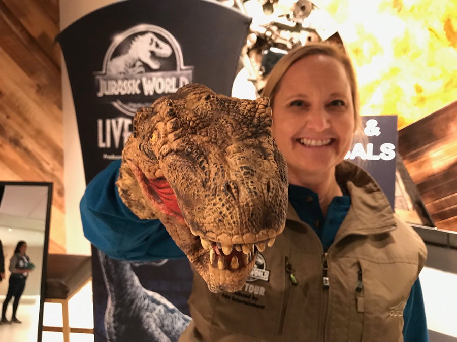 "In the casting forum, we have them emulate how to be a dinosaur – because if you can do emulate a dinosaur with a puppet, then you can probably be a dinosaur in the show," said Kori Kirschner, athletic trainer for "Jurassic World Live Tour." "We watch how they utilize their body, and there's a soundtrack, so they're roaring and sniffing and moving."