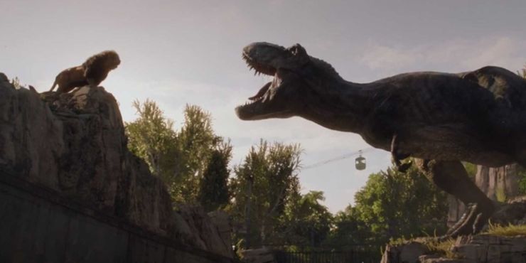 The most exciting clips from the trailers for Fallen Kingdom saw dinosaurs roaming around North America, like a T. rex roaring at a lion in a zoo and a Mosasaurus lurking beneath some surfers on a wave, but they weren’t really in the movie.