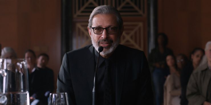 He bookends the movie with the same rhetoric we’ve heard over and over again throughout the franchise, all shot in the same room and wardrobe, suggesting Goldblum got it out of the way in one day.