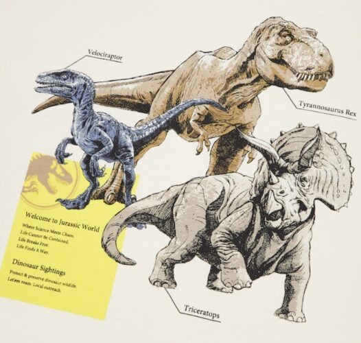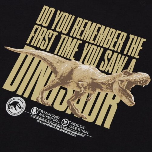 The other shirt merely states “Protect and preserve local dinosaur wildlife. Let ’em roam. Local outreach.” Sounds like perhaps the Dinosaur Protection Group or “DPG” that much of Fallen Kingdom’s merchandise was centered around may have branched out and has begun advocating for dinosaur wellbeing even in the wild? Or maybe this is yet another statement from the new “DTIA”? (Or maybe we’re just looking way too hard into some new shirt designs.)